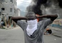 Un manifestant couvre son visage lors d'une manifestation anti-gouvernementale à Port-au-Prince, en Haïti, ce 14 mai 2014. Les manifestants ont défilé dans les rues...